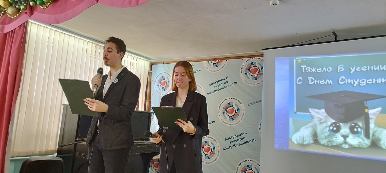 На протяжении всей праздничной программы зрителей радовали блистательные творческие номера, а искрометные шутки о нелегкой студенческой жизни и слова-поздравления представили наши бессменные ведущие Марк Бухтияров и Анастасия Балдакова (Лечебное дело, 3 курс). Они передали своё настроение, энергетику и положительные эмоции всем гостям и зрителям, находящимся в зале.